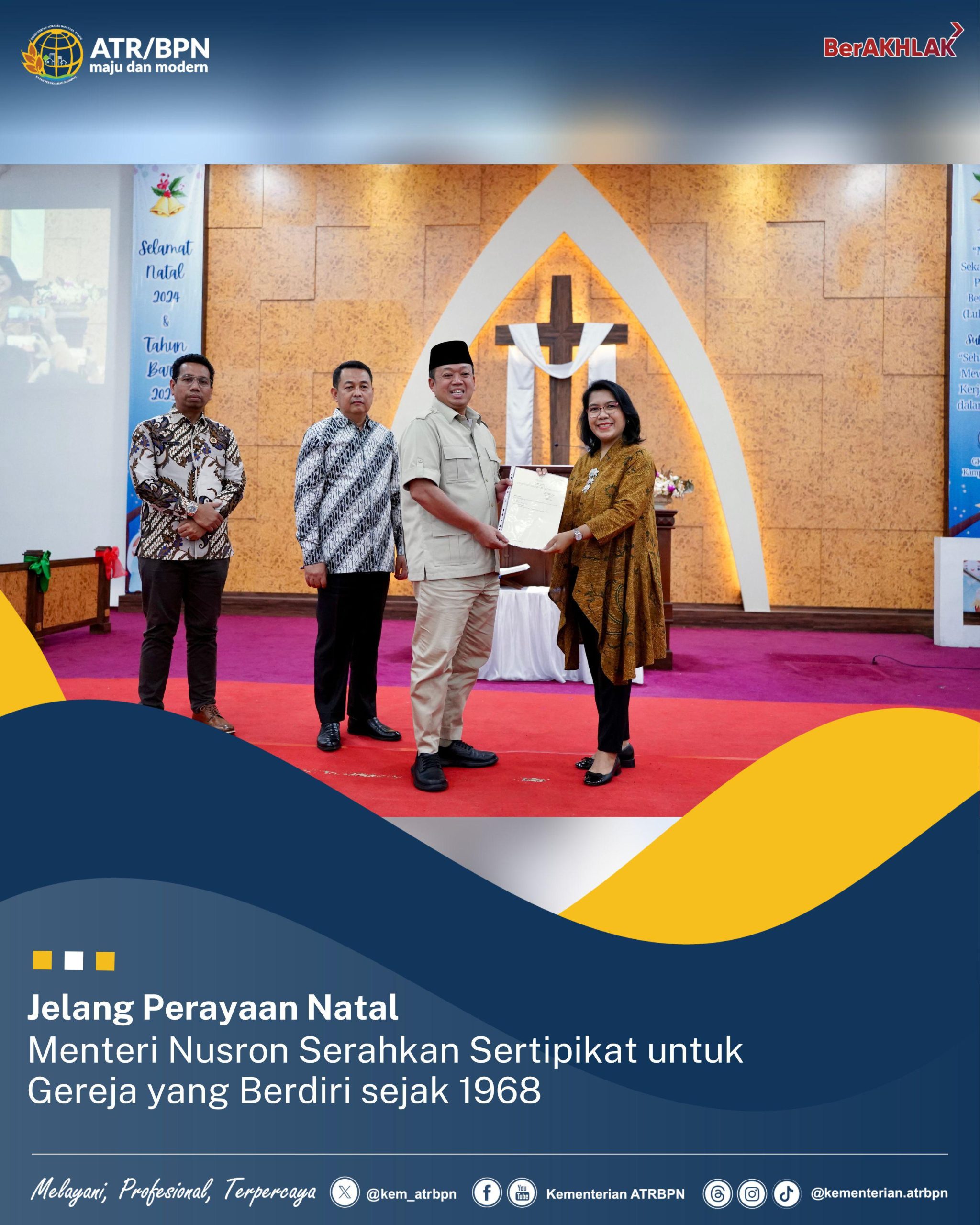 “Menjelang Natal ini, kami dari Kementerian ATR/BPN dapat menyerahkan SHM untuk lembaga keagamaan ini,” ujar Nusron.