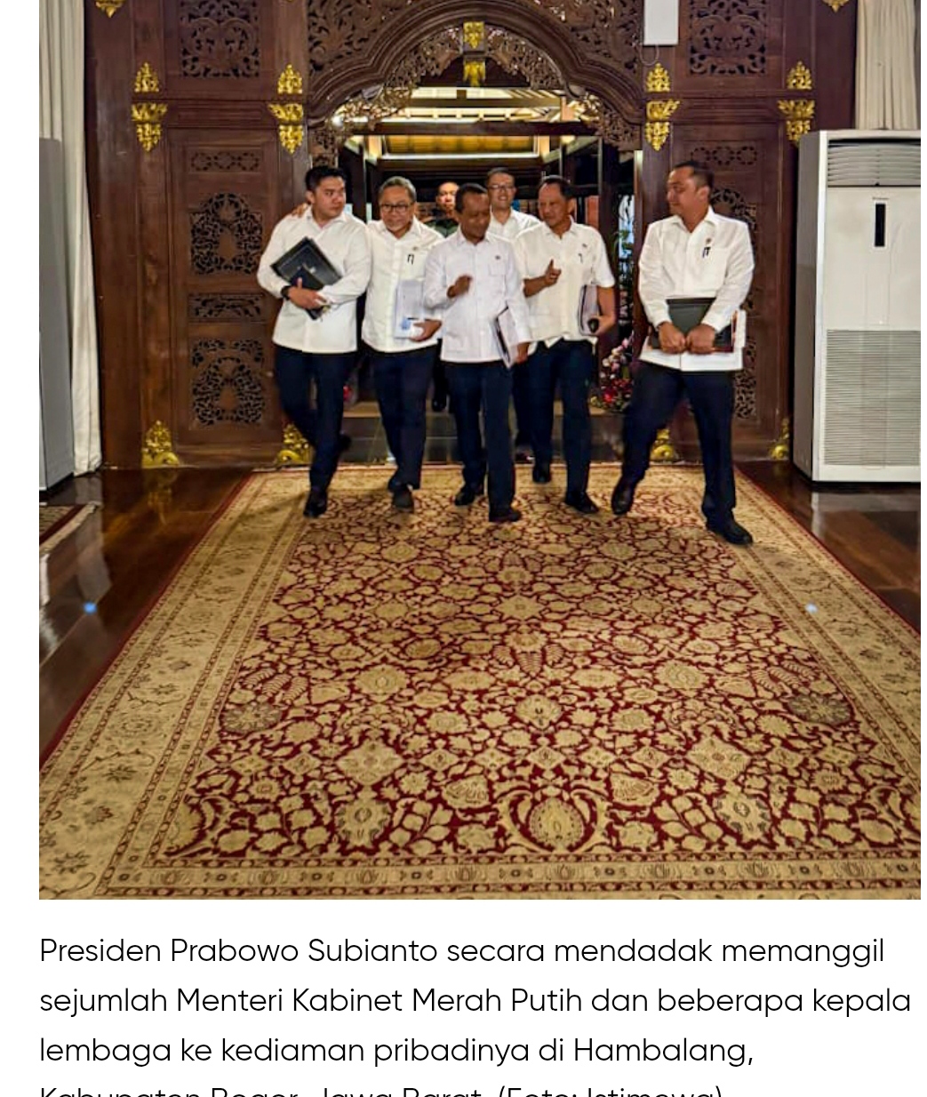 “Pada Selasa malam kemarin, 19 Agustus 2025, Presiden Prabowo Subianto secara mendadak memanggil sejumlah Menteri Kabinet Merah Putih dan beberapa kepala lembaga di kediaman pribadinya di Hambalang, Bogor,” tulis Seskab Teddy.