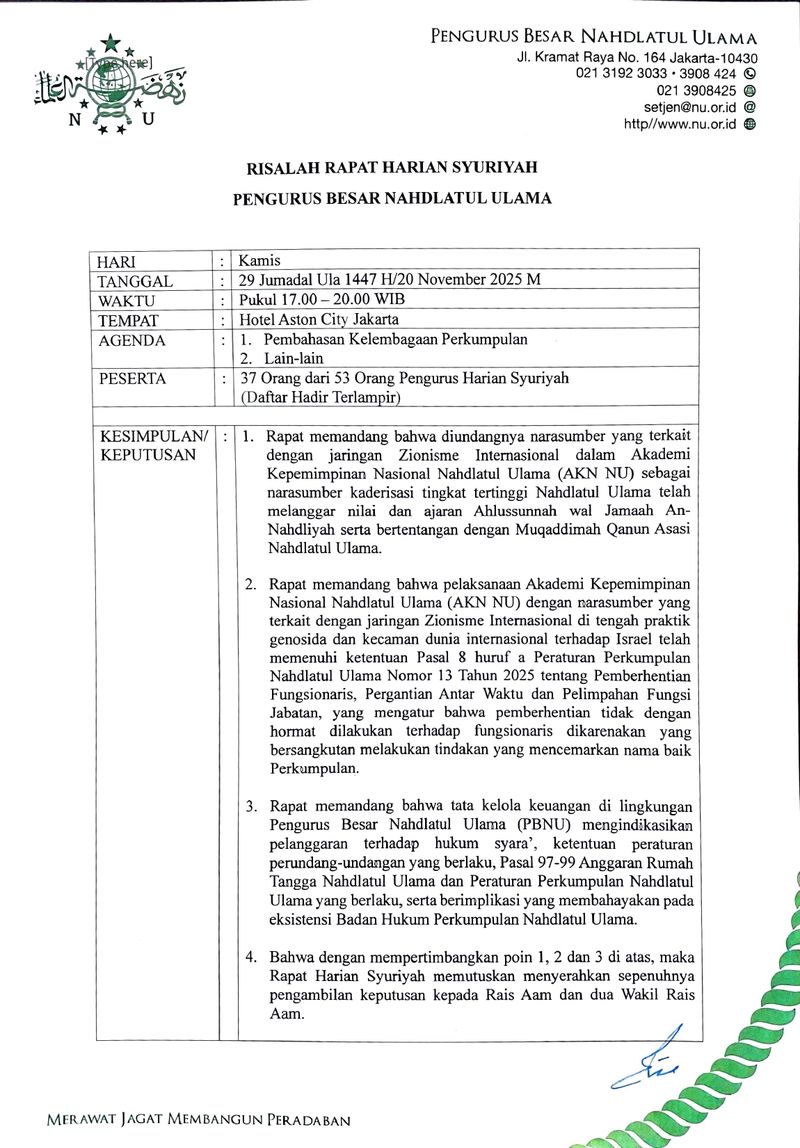 - Rapat memandang bahwa pelaksanaan Akademi Kepemimpinan Nasional Nahdlatul Ulama (AKN NU) dengan narasumber yang terkait dengan jaringan Zionisme Internasional di tengah praktik genosida dan kecaman dunia internasional terhadap Israel telah memenuhi ketentuan Pasal 8 huruf a Peraturan Perkumpulan Nahdlatul Ulama Nomor 13 Tahun 2025 tentang Pemberhentian Fungsionaris, Pergantian Antar Waktu dan Pelimpahan Fungsi Jabatan, yang mengatur bahwa pemberhentian tidak dengan hormat dilakukan terhadap fungsionaris dikarenakan yang bersangkutan melakukan tindakan yang mencemarkan nama baik Perkumpulan.