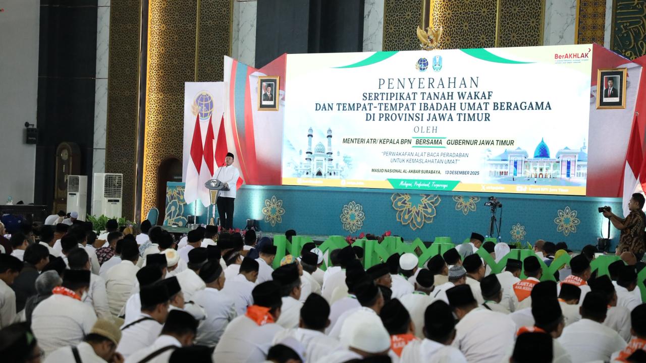 Surabaya – Menteri Agraria dan Tata Ruang/Kepala Badan Pertanahan Nasional (ATR/BPN), Nusron Wahid, bersama Gubernur Jawa Timur, Khofifah Indar Parawansa, menyerahkan sebanyak 2.532 sertipikat tanah wakaf dan rumah ibadah. Penyerahan tersebut berlangsung di Masjid Nasional Al-Akbar Surabaya, Sabtu (13/12/2025). Dalam kesempatan itu, Menteri Nusron menegaskan pentingnya kolaborasi antara pemerintah pusat dan daerah, lembaga keagamaan, serta perguruan tinggi guna mempercepat pendaftaran tanah wakaf dan rumah ibadah di Jawa Timur.